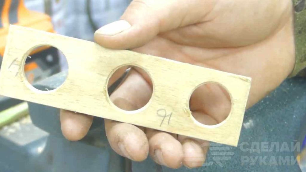 Далее в одной из заготовок необходимо просверлить три круглых отверстия (мастер использует для этого ступенчатое сверло).