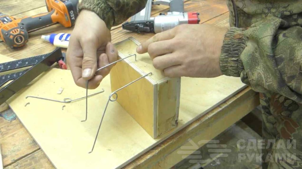 В задней стенке ловушки необходимо просверлить отверстия, в которые нужно будет установить самодельные пружины. Дополнительно мастер фиксирует их скобами для степлера.