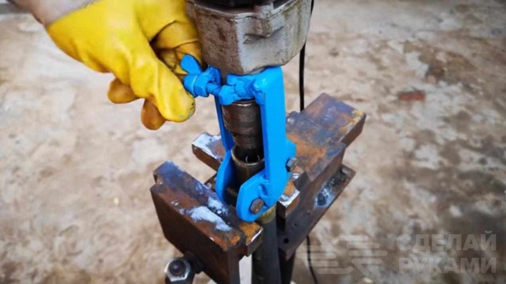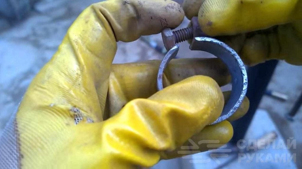 Сначала необходимо отрезать кольцо от стальной трубы подходящего диаметра. При помощи УШМ мастер вырезает небольшой кусок. Это кольцо будет надеваться на корпус электрической дрели. К этому кольцу по краям мастер приваривает болт с гайкой. Хомут затягивается барашковой гайкой.