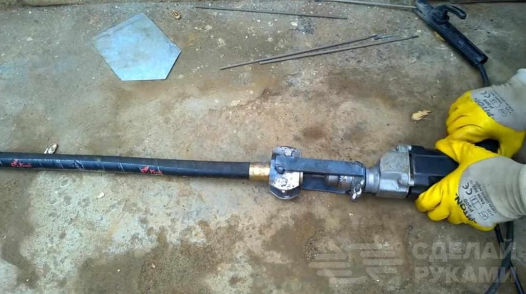Потом хомут, который надевается на «горловину» электродрели, нужно будет жестко соединить с пластинами на шланге при помощи двух полос металла.