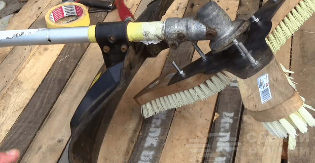 На следующем этапе сверлим отверстия в самих щетках. После этого прикручиваем их к лопастям диска при помощи болтов с гайками. В данном случае болты желательно использовать диаметром не менее 8–10 мм.