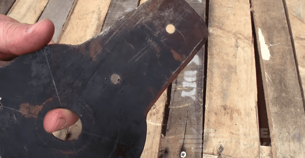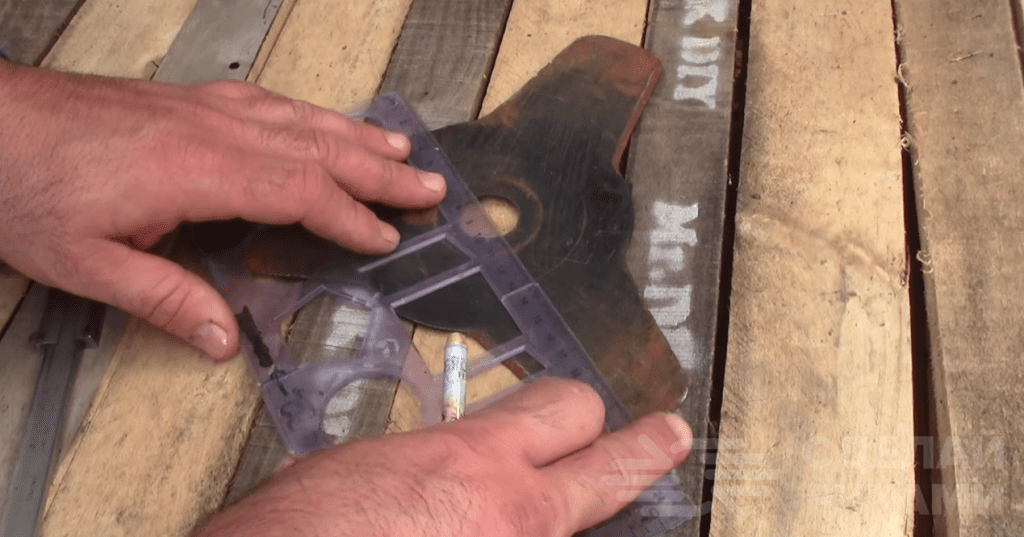После разметки линий размечаем и сверлим отверстия под болты, с помощью которых будут крепиться щетки. Всего надо сделать шесть сквозных отверстий — по два на каждой лопасти режущего диска для бензинового триммера.