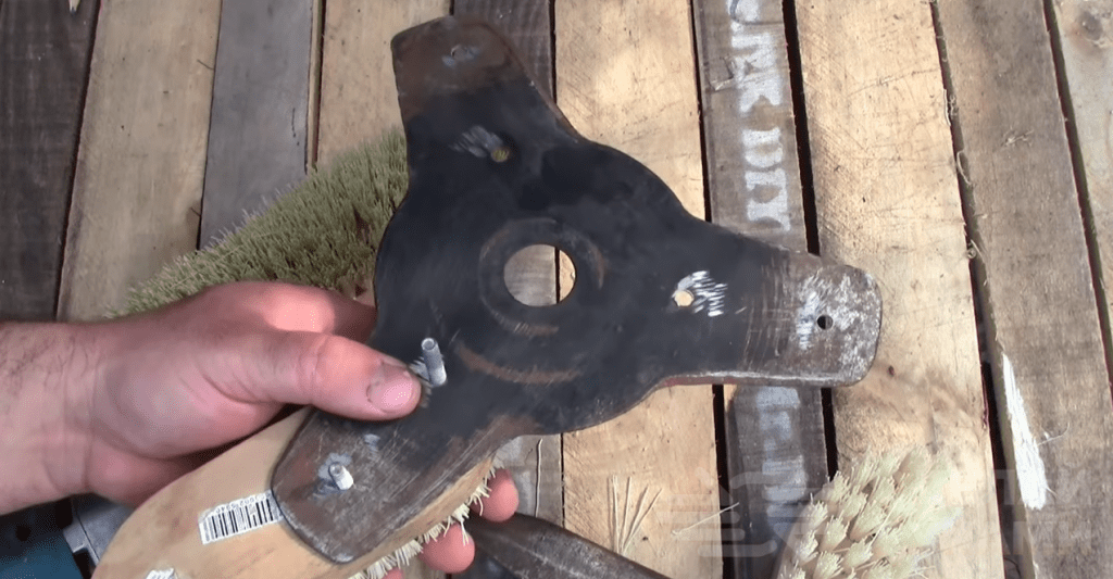 Кроме самого режущего диска, потребуются также три деревянные щетки с жесткими ворсинками. Первым делом надо разметить три центральные осевые линии на режущем диске для триммера — на них будут располагаться щетки.
