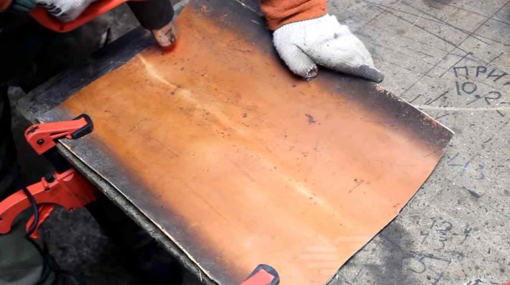 Далее делаем разметку. Нагреваем лист феном и загибаем под прямым углом три стороны заготовки. Должны получиться ровные бортики.