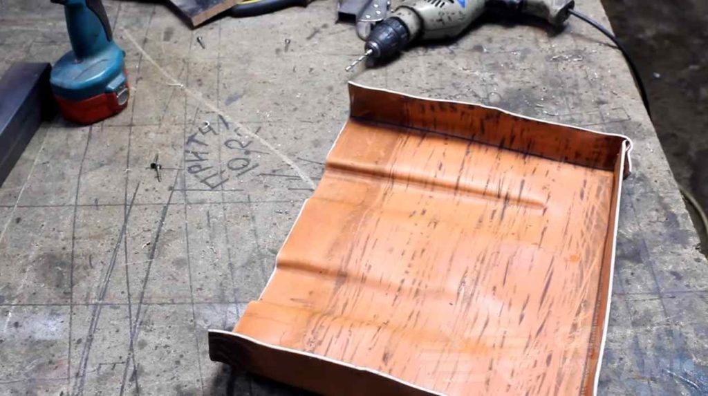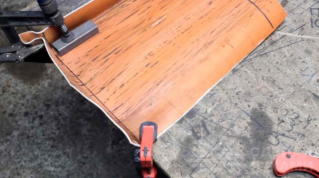 Первым делом отрезаем заготовку из рыжей ПВХ-трубы нужной длины. Разрезаем ее болгаркой вдоль. После этого с помощью строительного фена придаем заготовке форму плоского листа. Для удобства один край зажимаем струбцинами.