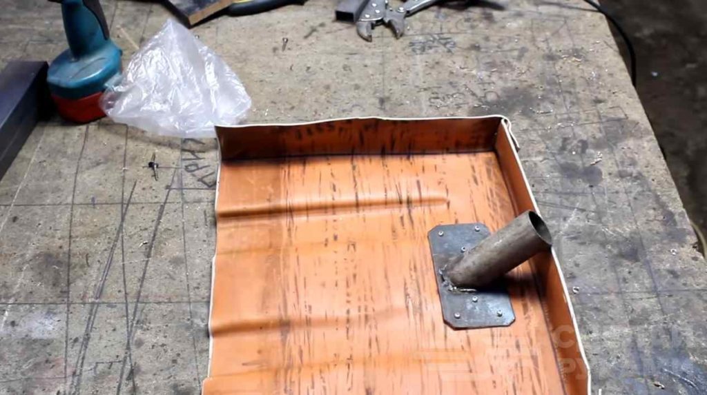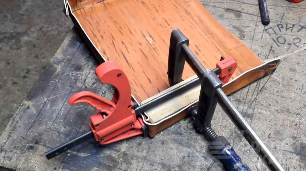 На следующем этапе автор делает в лопате две продольные канавки. Нагреваем пластик и прикладываем квадратную профильную трубу, фиксируя ее с помощью струбцины.
