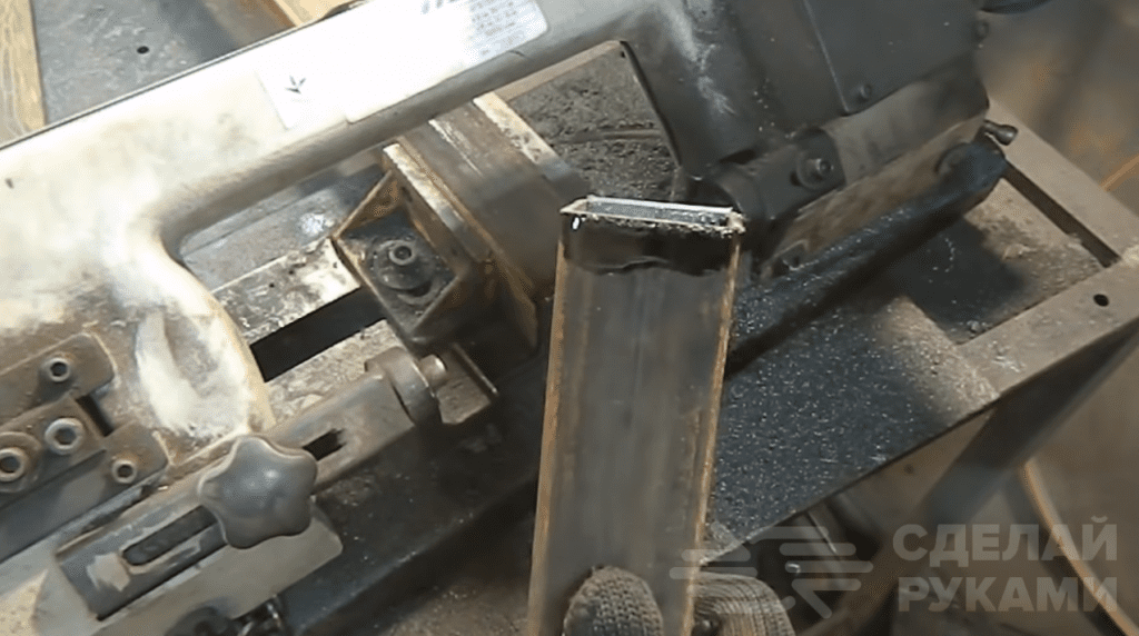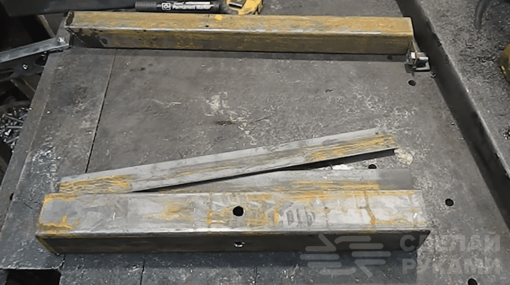Первым делом отрезаем от профильной трубы два куска длиной по 50 см под углом примерно 40 градусов. Также для данной самоделки потребуется профиль 50х50 мм и полоса металла шириной 4 см. От профиля отрезаем кусок 40 см под углом 90 градусов.