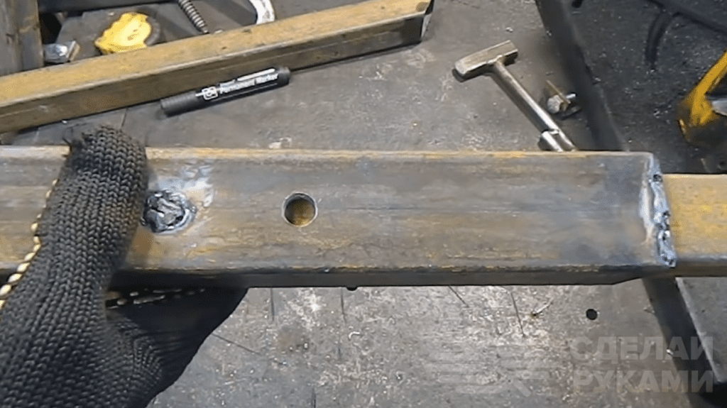 Чтобы прихватить полосы посередине, в профильной трубе нужно предварительно просверлить сквозное отверстие. На следующем этапе отрезаем от профиля 40х40 мм отрезок длиной 80 см. Далее размечаем и сверлим отверстия для регулировки приспособления по высоте.
