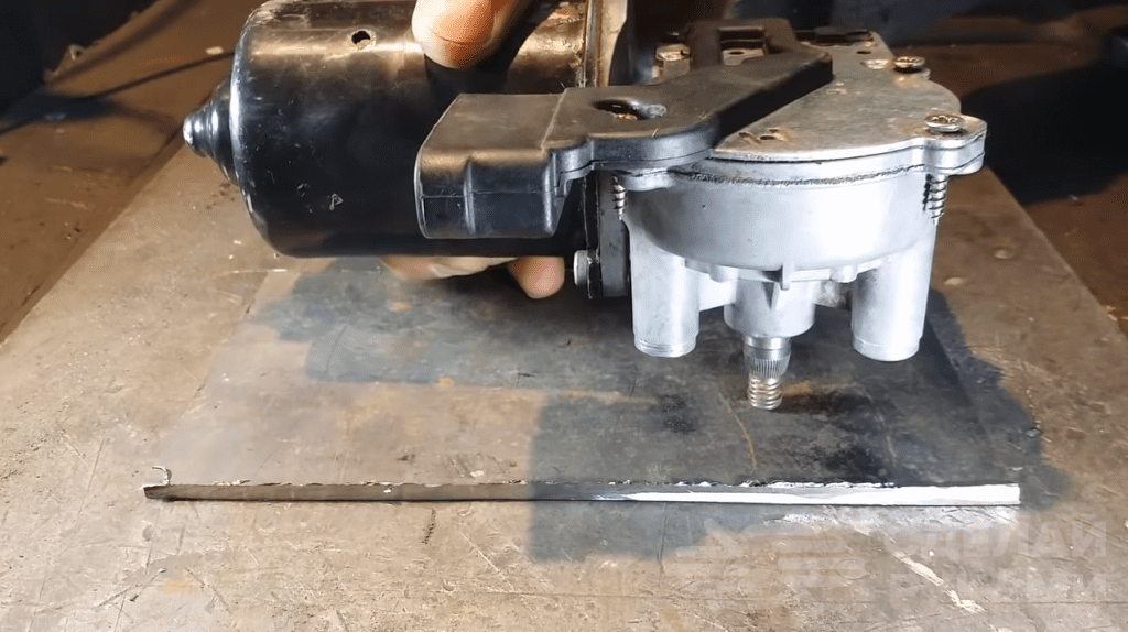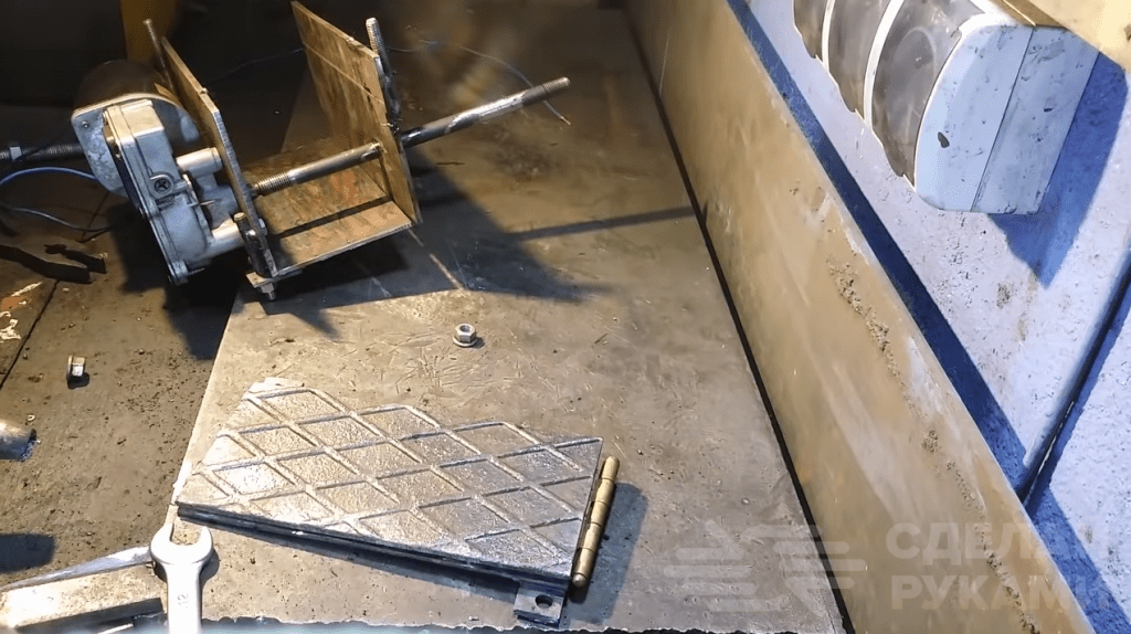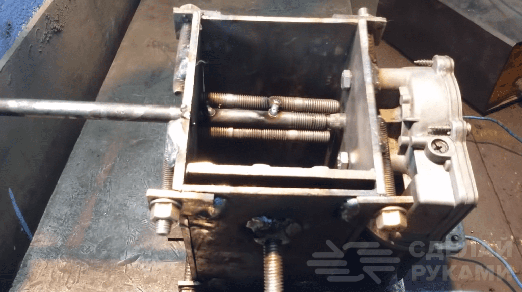 Прикручиваем моторчик стеклоподъёмника автомобиля к пластине на болты. Затем отрезаем по размеру еще две пластины, и свариваем корпус орехокола. К одной из боковых стенок корпуса с помощью обычной петли крепим подвижную пластину.