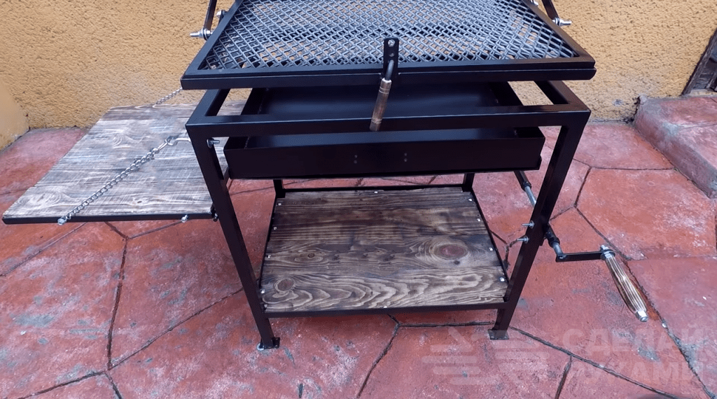 Потом останется только изготовить поддон для углей, а также сделать механизм его регулировки по высоте. Подробный процесс сборки оригинального стола барбекю для дачи и дома вы можете посмотреть в видеоролике на сайте.