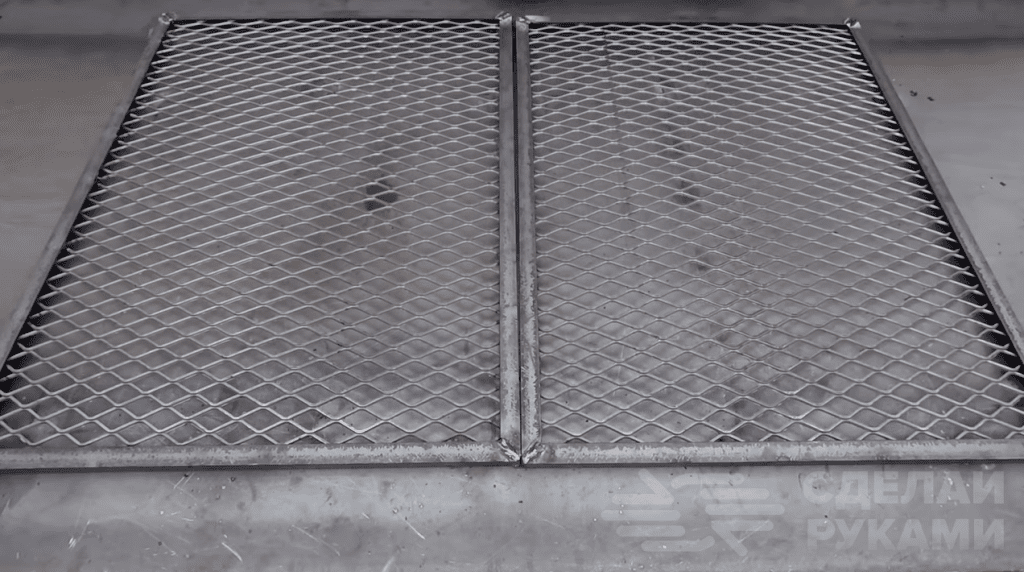 Первым делом надо отрезать восемь длинных отрезков металлического уголка – в соответствии с чертежными размерами. После этого свариваем две прямоугольные рамки. Далее отрезаем два куска стальной решетки по размеру и привариваем к каркасам.