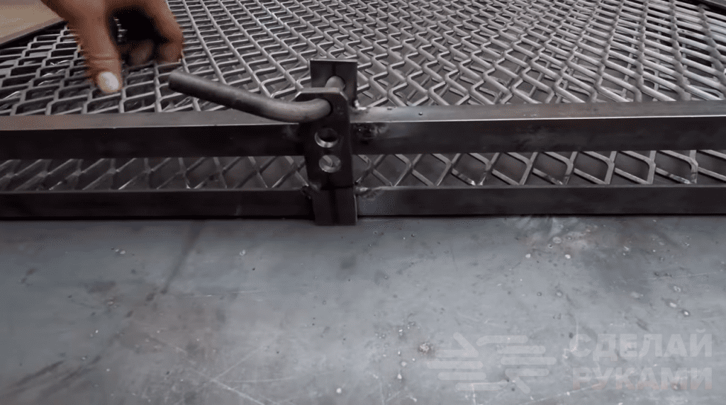 Соединяем металлические рамки с решеткой между собой при помощи двух петель. На одной из сторон привариваем две пластины с отверстиями. Они нужны для регулировки подъема второй, открывающейся рамки. По бокам привариваем по два длинных болта.