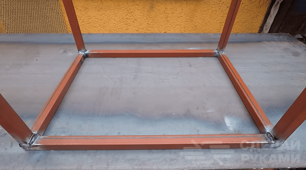 На следующем этапе надо будет нарезать необходимое количество заготовок из профильной трубы — для сборки каркаса. Сначала свариваем верхнюю часть в виде прямоугольной рамки, а затем привариваем вертикальные стойки. В нижней части стола барбекю привариваем еще одну рамку для полки.