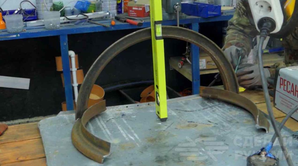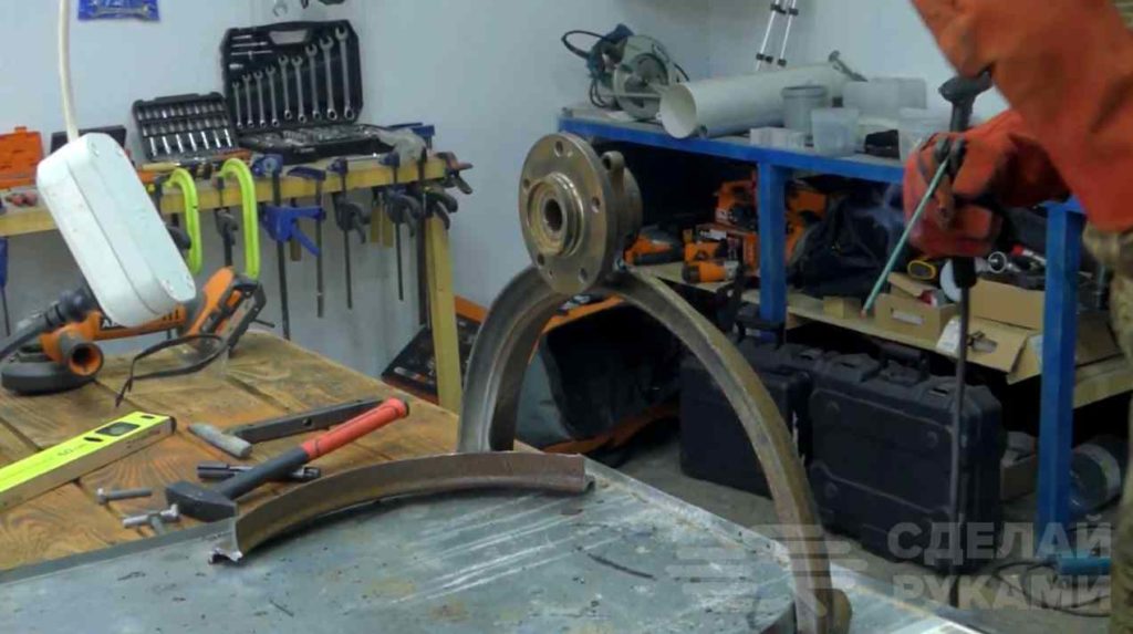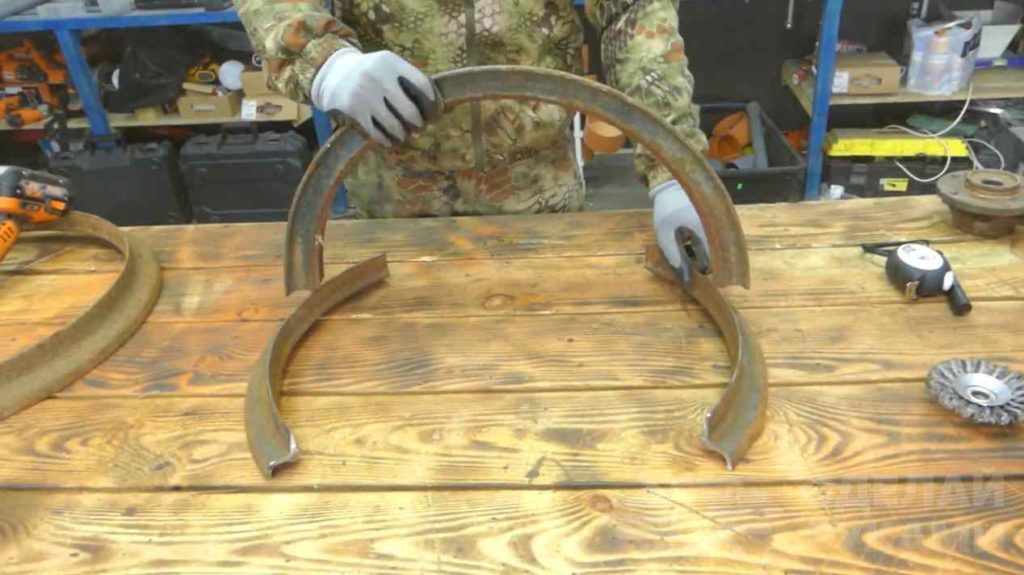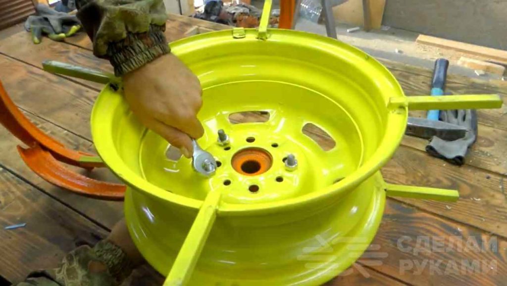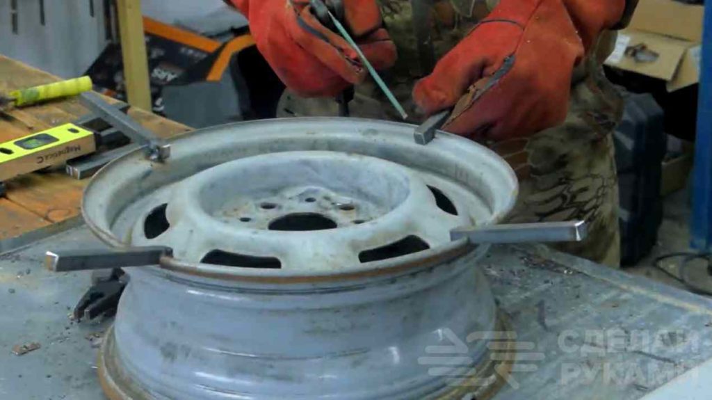 В колесном диске автор вырезает пазы, в которые потом вставляет отрезки квадратного прутка длиной по 12 см, и обваривает их.