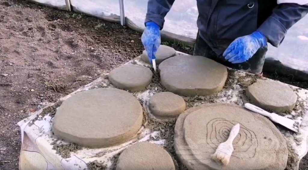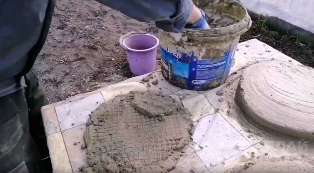 Замешайте плотную цементную смесь, которой легко будет придать форму руками. Вам понадобится металлическая сетка. Загните её края и вложите в центр изделия. Так вы обезопасите плитку от расколов.