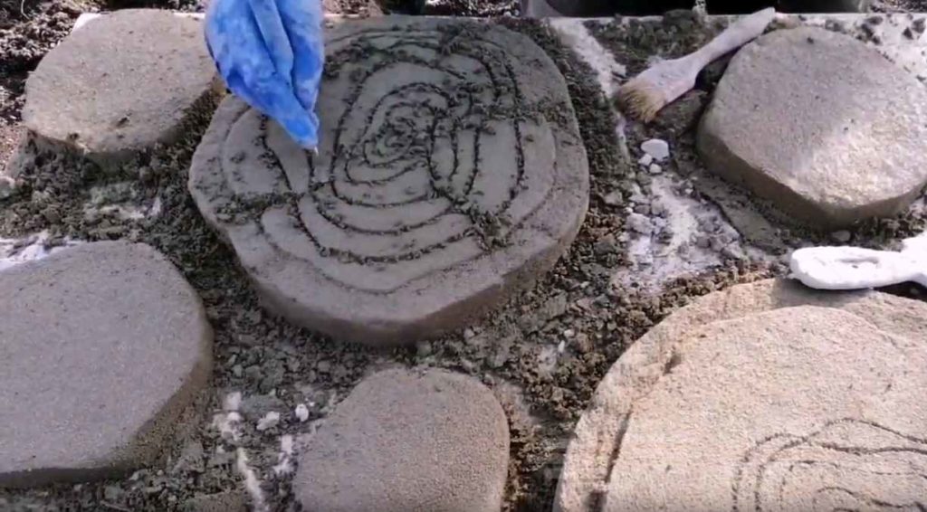 Теперь ножом обведите контур, отступая от края на несколько сантиметров, и частично срежьте внешнюю часть. Излишки цементной смеси смахивайте кистью.
