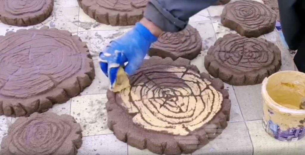 Белой краской нанесите последние штрихи, и плитка готова! Подробнее о том, как сделать плитку в виде древесных спилов без заливочных форм, можно посмотреть в данном видеоролике.