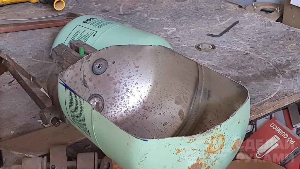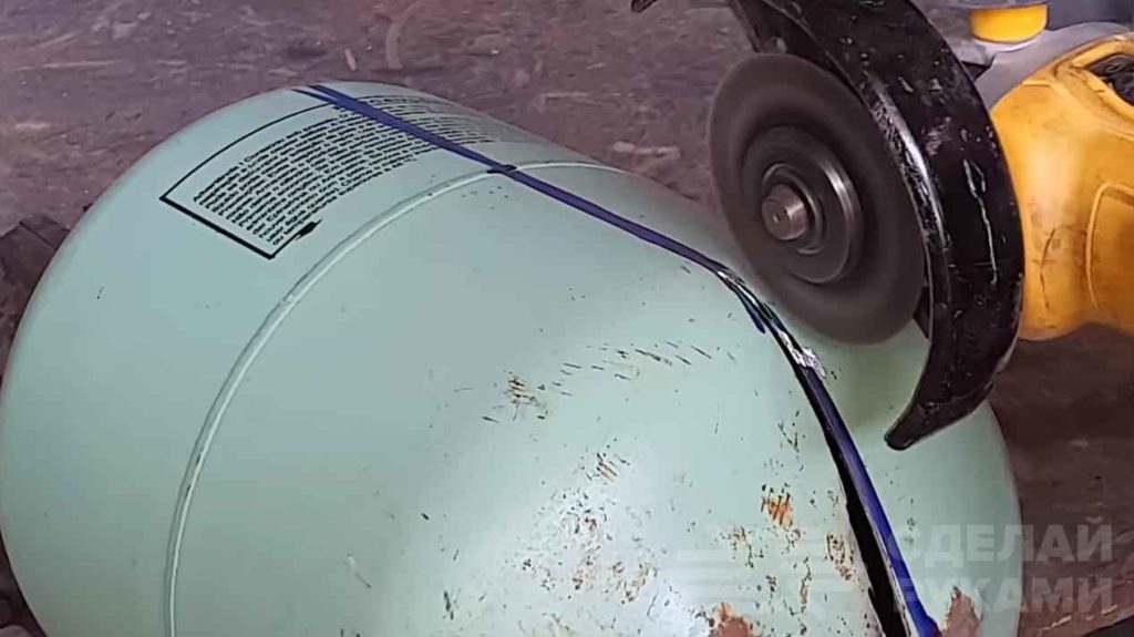 Первым делом отрезаем от баллона ручки, которые находятся в верхней части. Затем делаем разметку и разрезаем баллона на две части.