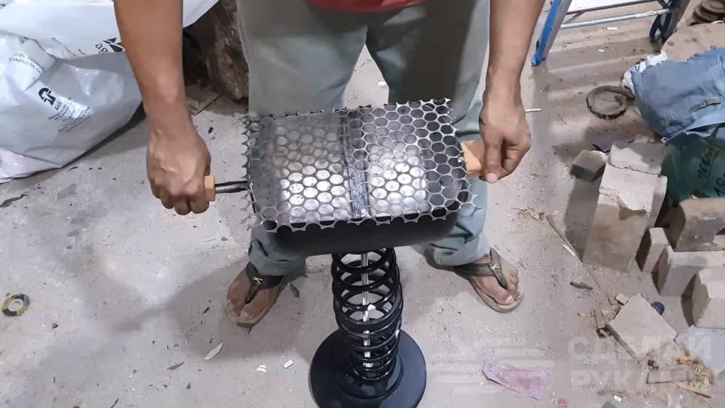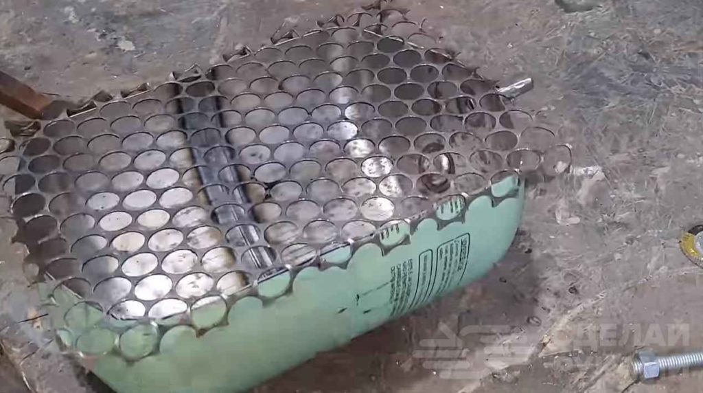 Также нужно будет отрезать по размеру кусок металлической решетки с круглыми отверстиями. Загибаем ее края, чтобы она плотно «садилась» на чашу из баллона.