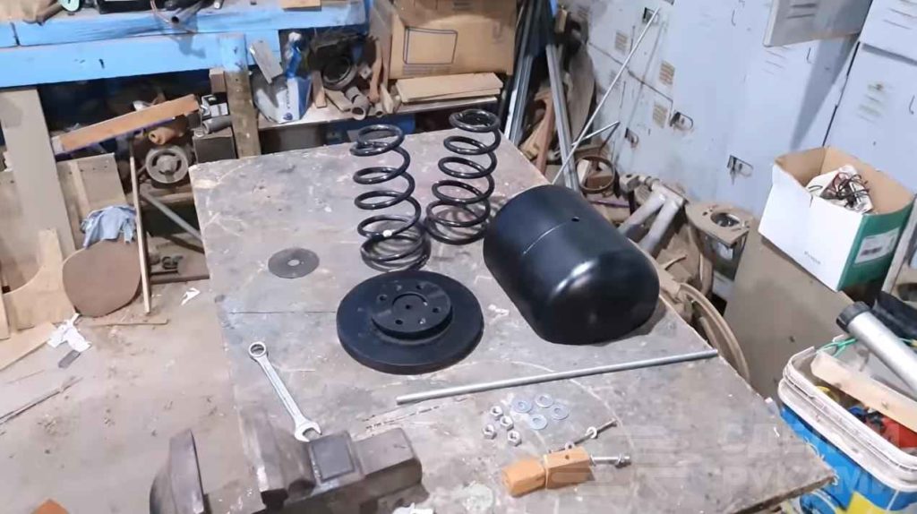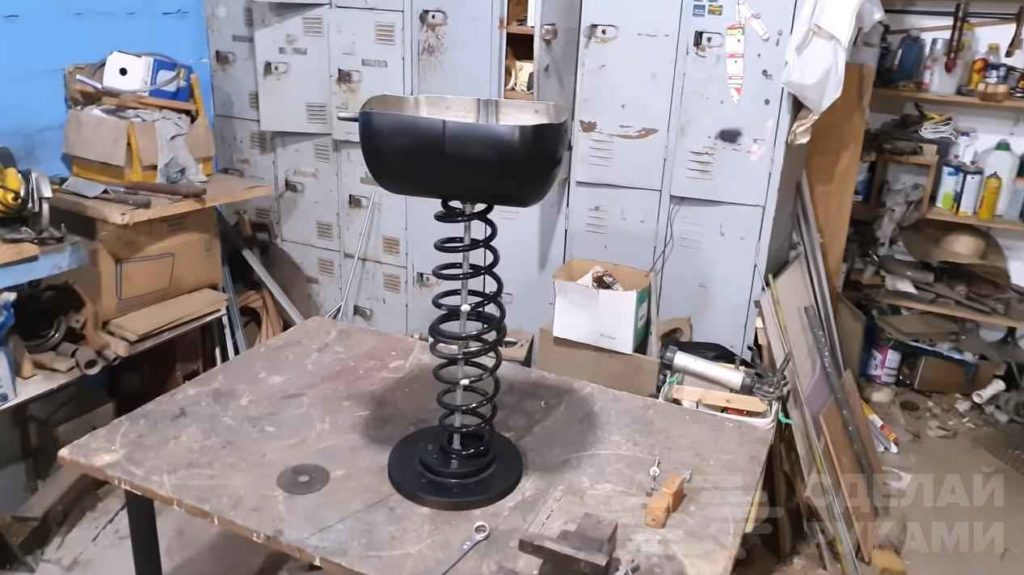 В отверстие в основании устанавливаем длинную шпильку, и фиксируем ее гайкой. На шпильку надеваем две пружины от амортизаторов. Далее в чаше сверлим отверстие, надеваем на шпильку и фиксируем гайкой.