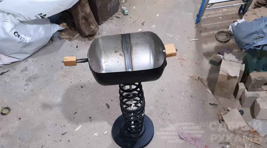 По бокам чаши автор прикручивает две деревянные ручки, чтобы удобно было поднимать и переносить барбекю. Вот, собственно, и все.