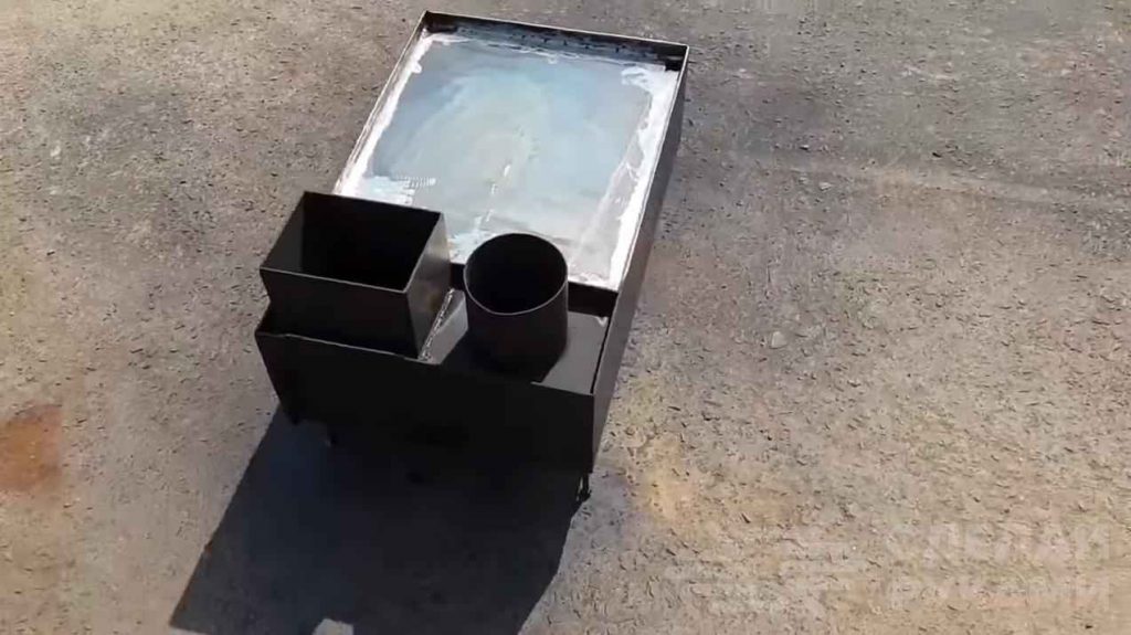 После этого нужно будет приварить к коробу крышку, которая и будет являться варочной поверхностью. Сверху приваривается маленький короб, через который будут потом загружаться дрова, и кусок круглой трубы (дымоход).