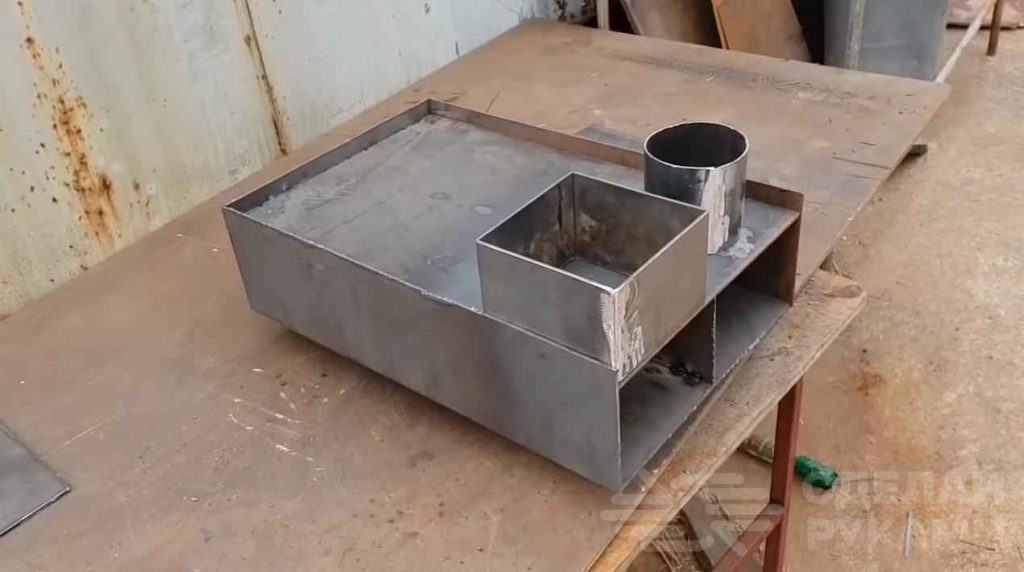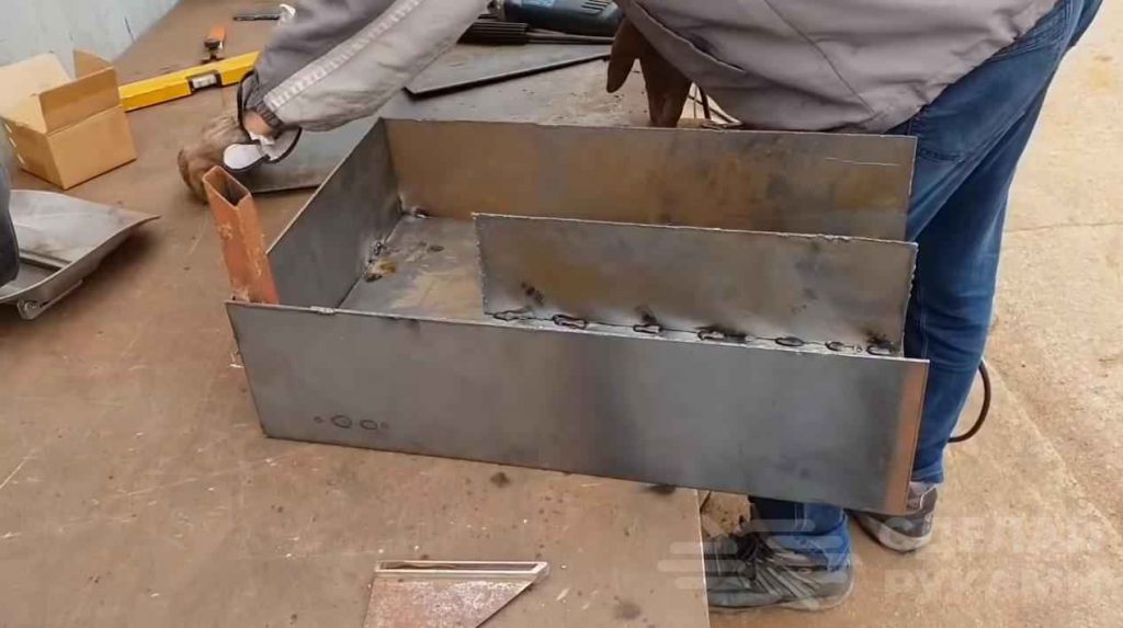 На следующем этапе из нарезанных заготовок необходимо будет сварить открытый короб прямоугольной формы. Внутри него автор приваривает перегородку из металлической пластины, а в углу — кусок профильной трубы.
