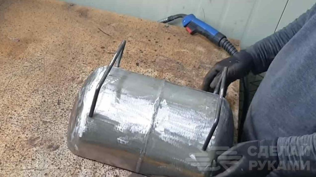 На следующем этапе автор отрезает два круглых прутка, сгибает их, затем приваривает к одной из половинок баллона. Получились ножки, на которых будет стоять печь.