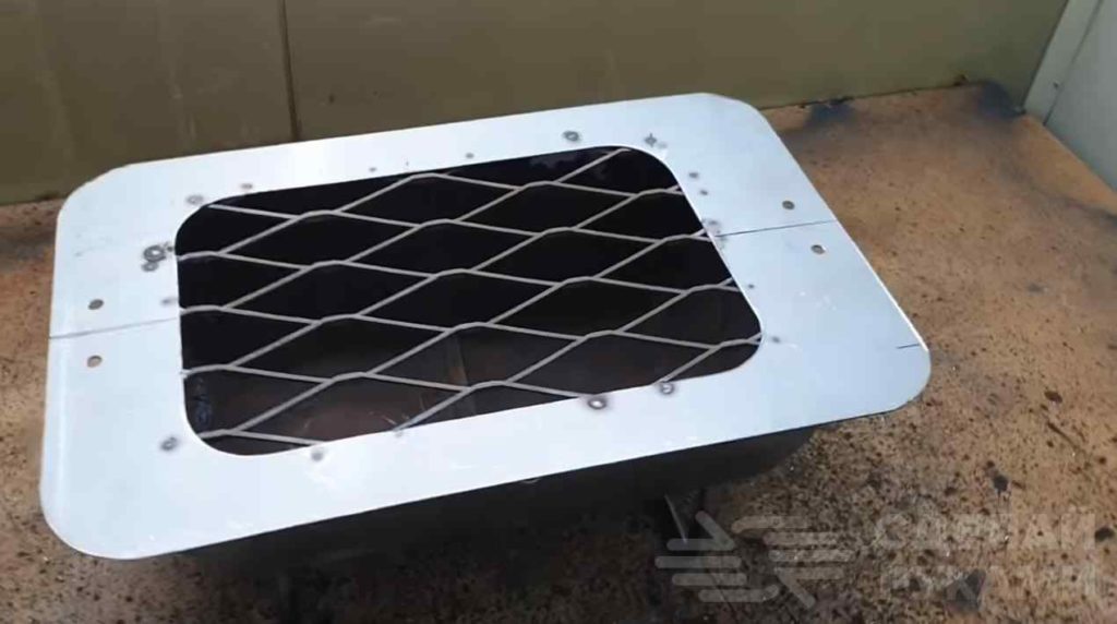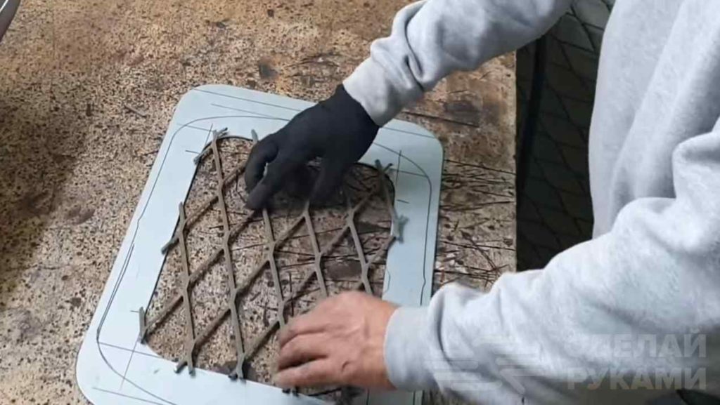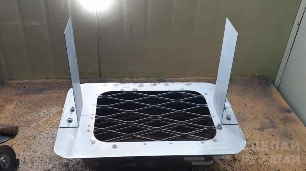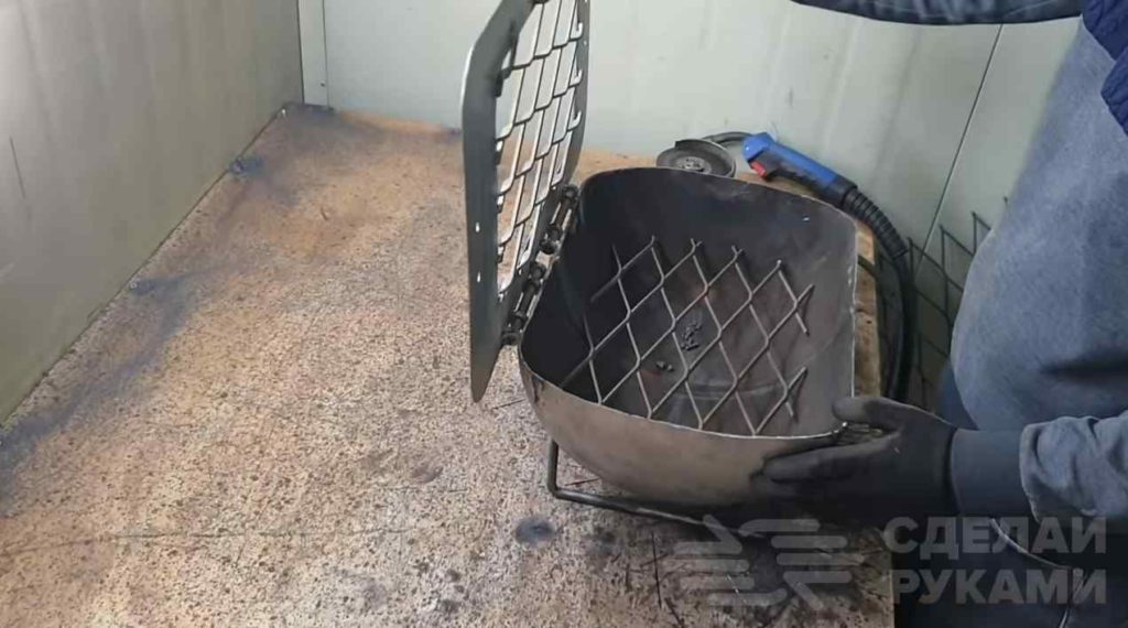 Далее необходимо будет отрезать лист металла и вырезать в нем середину. Привариваем к заготовке металлическую решетку. Сварные швы надо будет зачистить болгаркой.