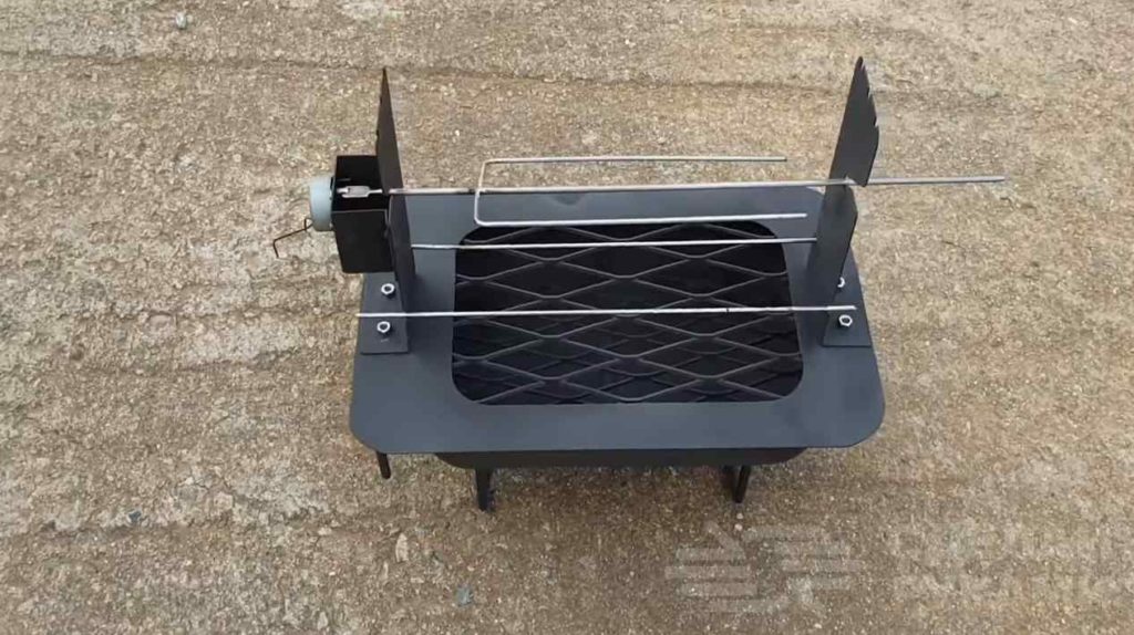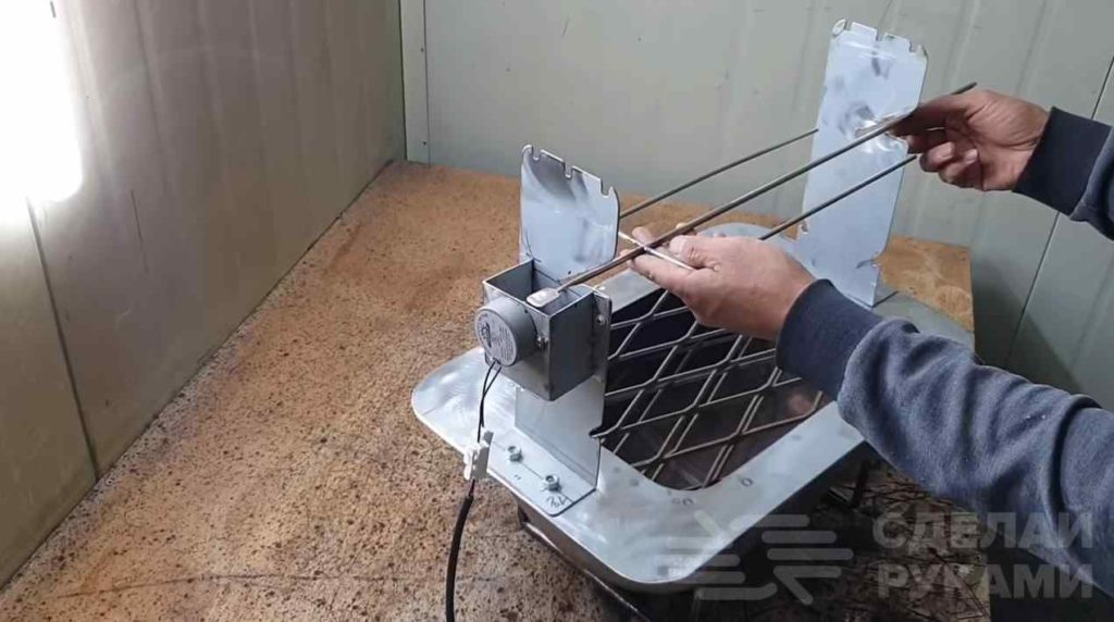 Далее из прутков из нержавеющей стали мастер изготавливает вертел, а также крепит к одной из стоек электродвигатель. Дополнительно в стойках надо сделать пазы для установки шампуров.