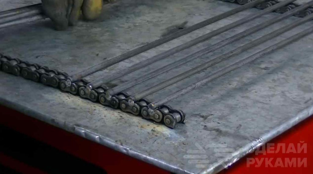Для начала подготовим два отрезка цепи такой длины, чтобы в свёрнутом состоянии она была чуть меньше диаметра будущего тубуса. Отрезаем необходимые отрезки и укладываем их параллельно друг другу. Подготовим куски гладкой арматуры необходимой длины.
