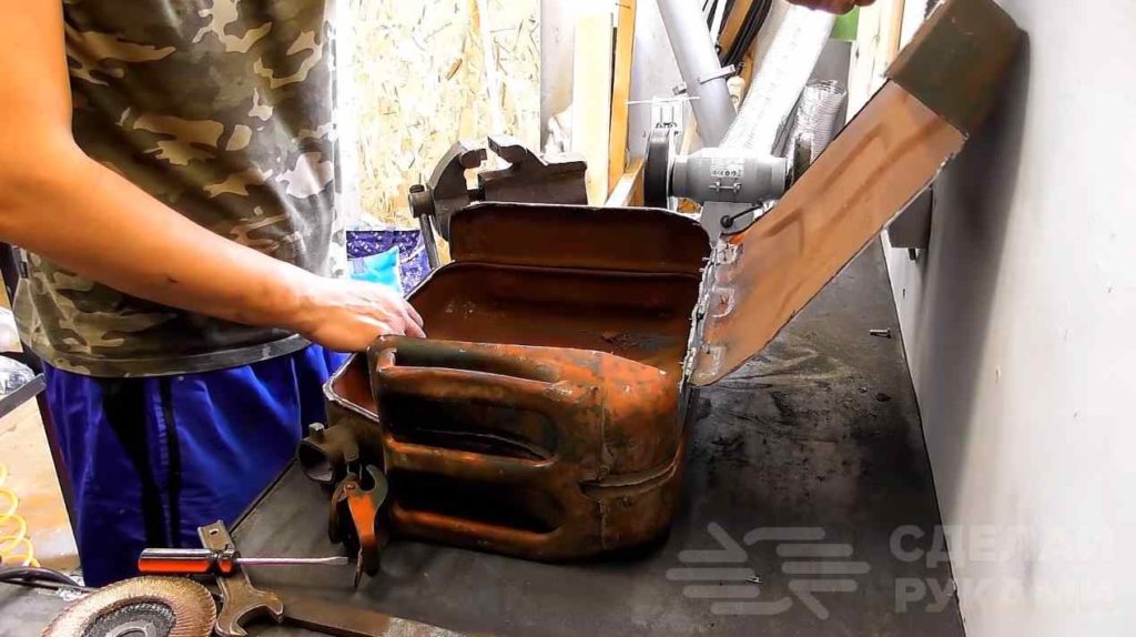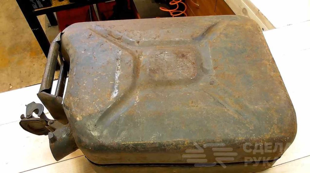 Первым делом канистру необходимо будет очистить от грязи и ржавчины. Для этого можно воспользоваться лепестковым диском или кордщеткой.