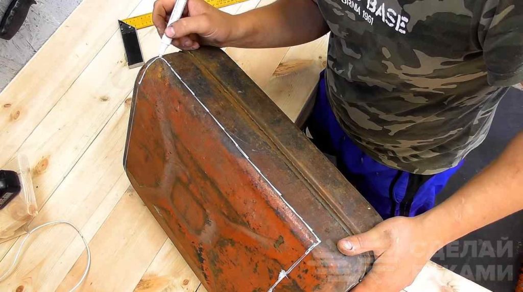 Далее автор делает разметку белым маркером, необходимо по максимуму сохранить все ребра жесткости.