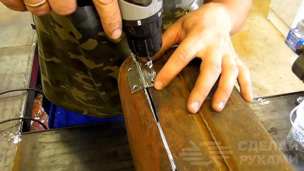 С помощью болгарки мастер делает пропил. Потом крепит на саморезы три петли и обваривает их. После этого можно уже до конца прорезать крышку.