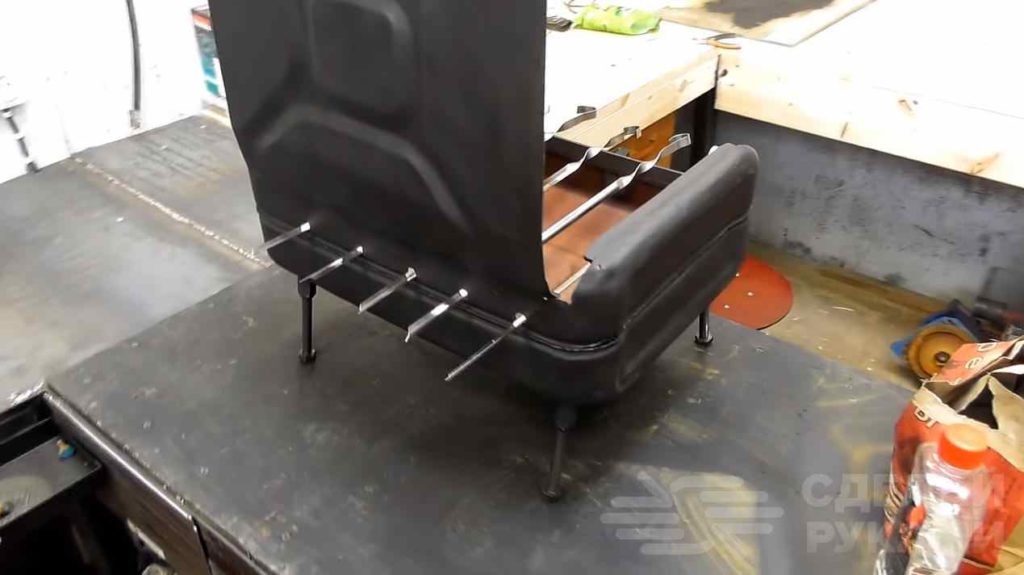 Из листа металла толщиной 2 мм автор отрезает две полосы шириной 20 мм и приваривает их внутри канистры.