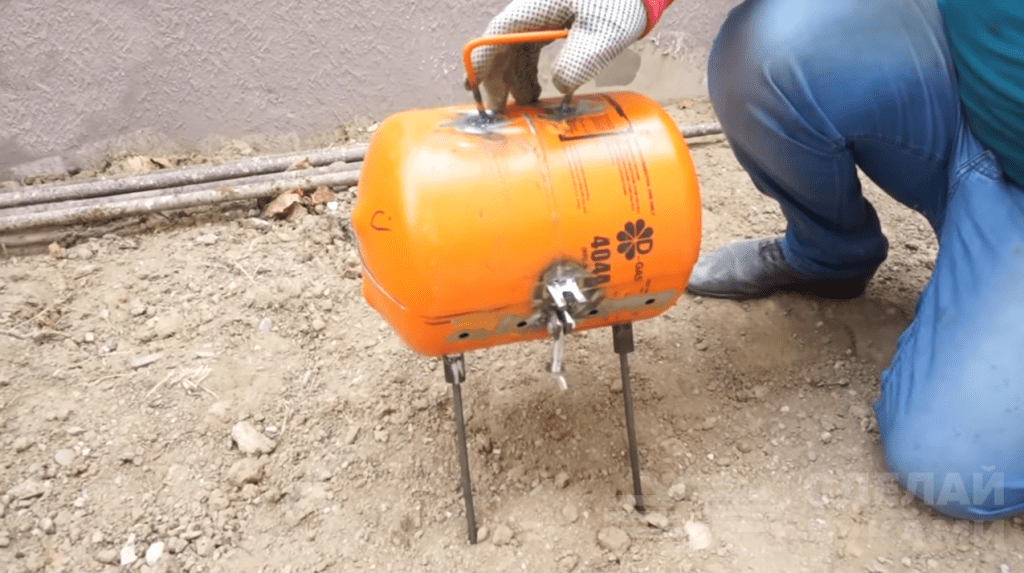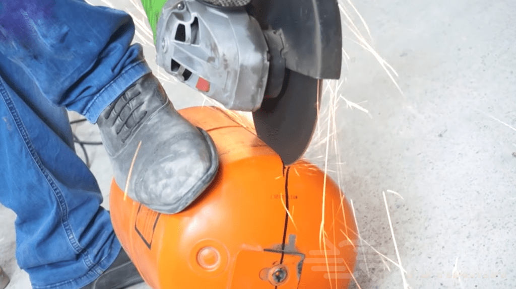 Первым делом газовый баллон нужно разрезать болгаркой пополам. Обратите внимание, что сам баллон должен быть пустым, а конденсат слит. Причем любые работы с применением электроинструмента должны проводиться только в том случае, если баллон заполнен водой.