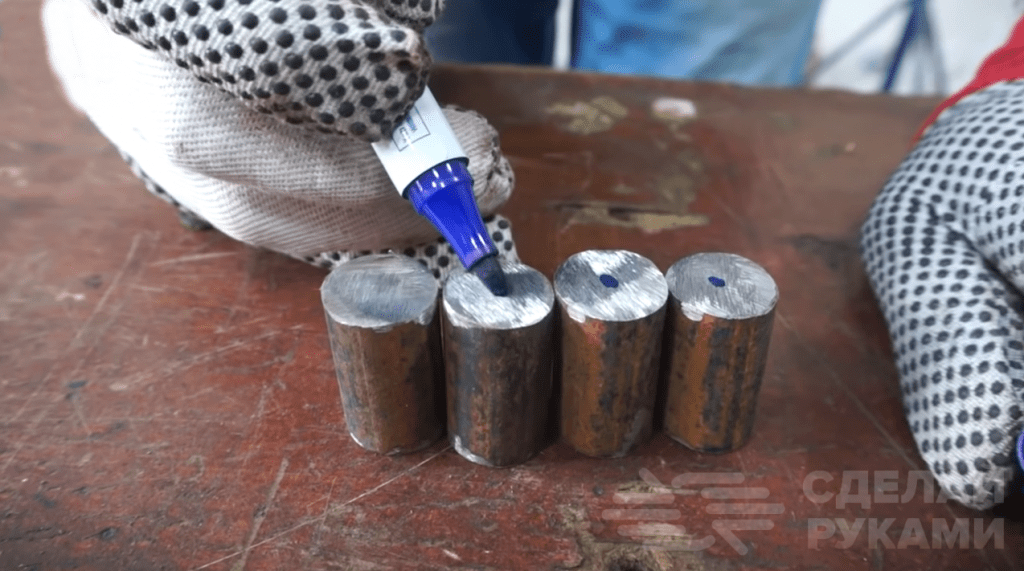 От стального кругляка отрезаем четыре заготовки одинакового размера, в которых нужно будет просверлить глухие отверстия. После этого привариваем заготовки к нижней половинке пропанового баллона — это будут «посадочные» места для четырех ножек походного мангала.