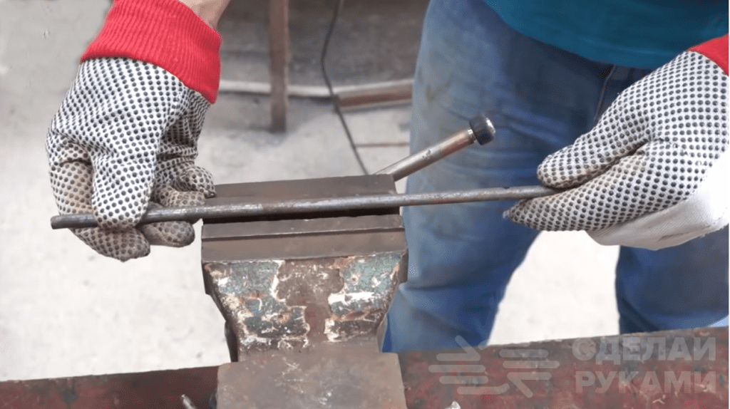 Сами ножки делаем из стального прутка подходящего диаметра. Сначала надо определиться с высотой мангала, после чего отрезаем болгаркой четыре ножки требуемой длины. Поскольку конструкция мангала походная, а не стационарная, то и ножки должны быть быстросъемными.