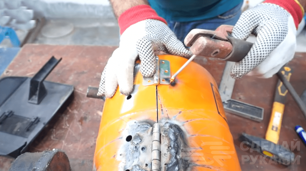 На последнем этапе работ сверлим отверстия для шампуров, а также соединяем две половинки баллона при помощи двух петель. К верхней части мангала привариваем ручку, чтобы удобно было открывать, а также делаем простую защелку.