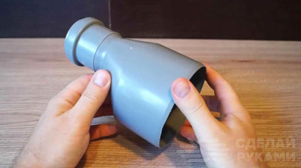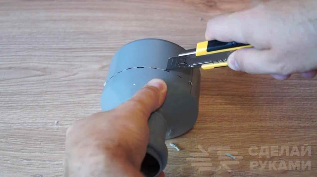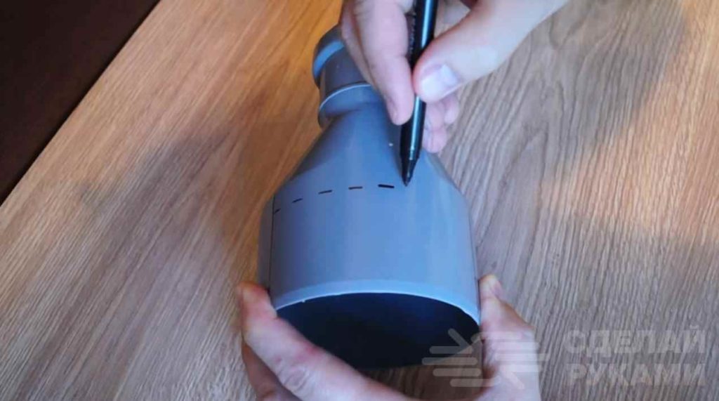 В первую очередь на канализационном переходнике автор делает разметку, потом вырезает небольшую часть.
