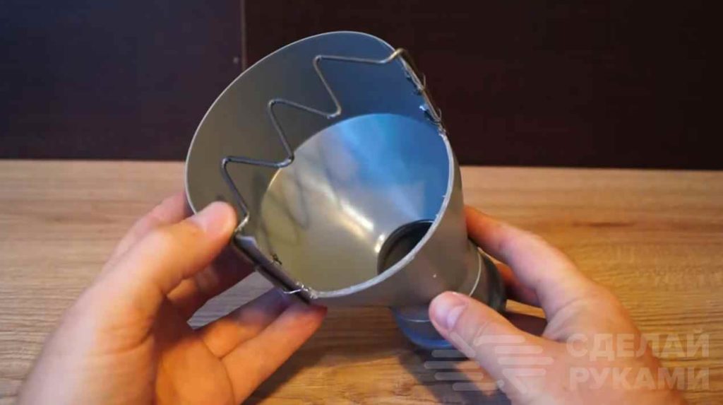 Из стального прутка автор делает «насадку», которая будет фиксироваться в канализационном переходнике. Для этого в нем нужно просверлить четыре отверстия.