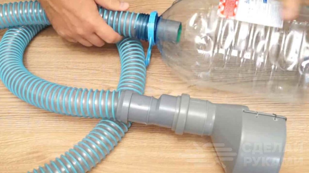 На последнем этапе вставляем в переходник гофрированный шланг, второй конец которого нужно вставить в пластиковую бутылку.