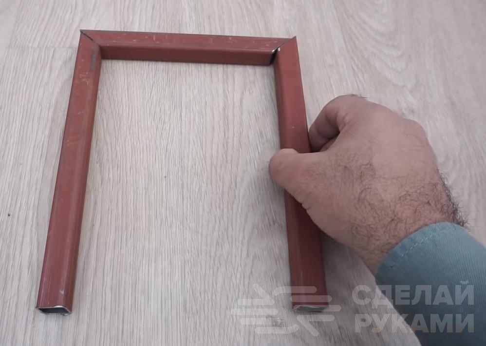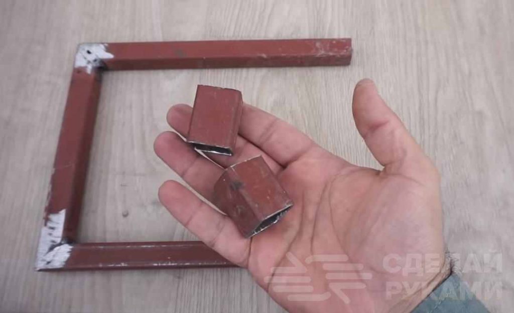 На следующем этапе нужно будет отрезать еще один кусок профильной трубы, но уже большего размера (25х25 мм), и разрезать его пополам. Получившиеся заготовки надеваем на П-образную деталь.