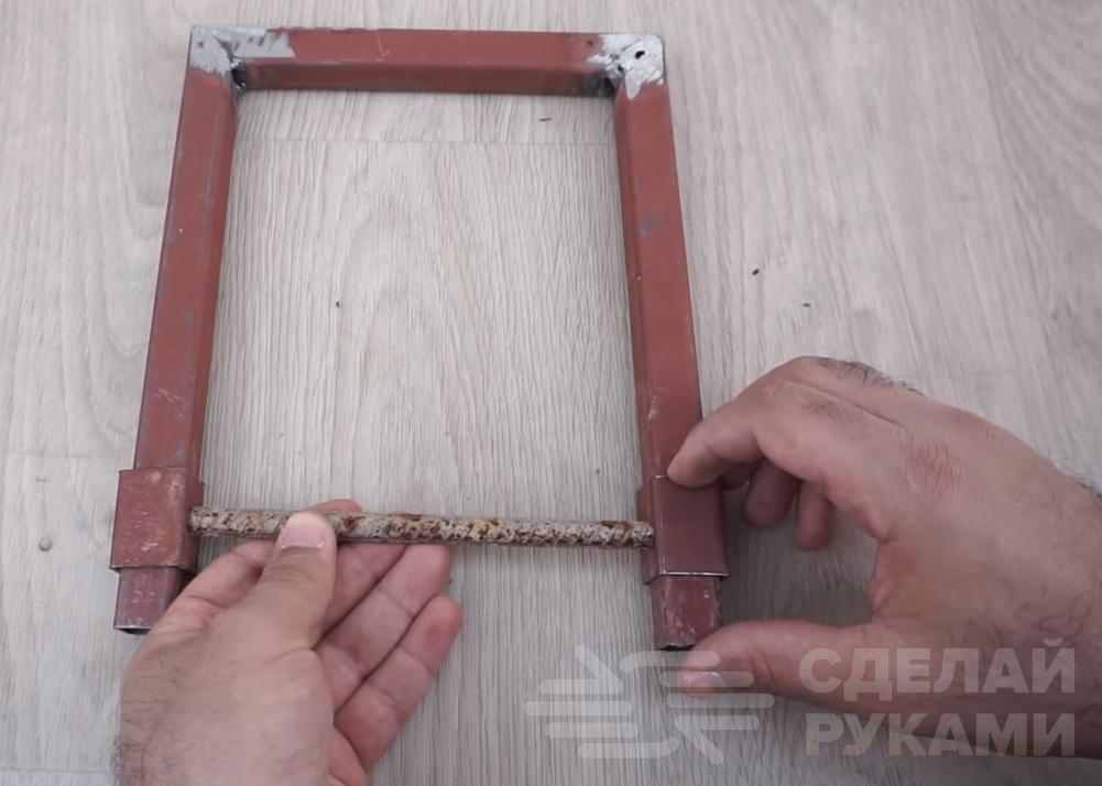 Далее автор отрезает кусок арматуры (можно также обычный круглый пруток использовать или квадрат). Его нужно приварить к двум заготовкам из профиля 25х25 мм.