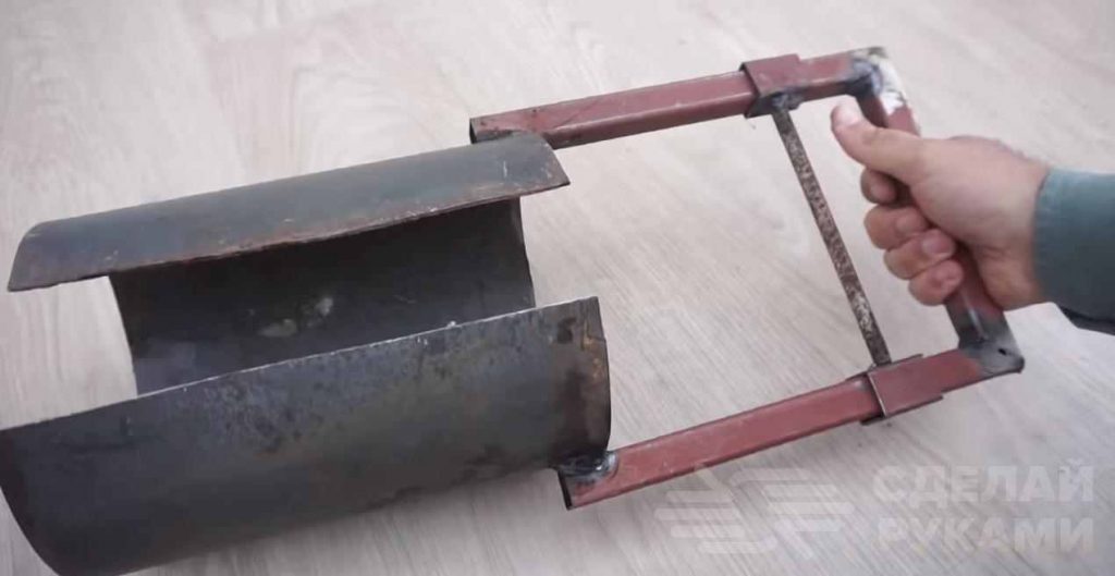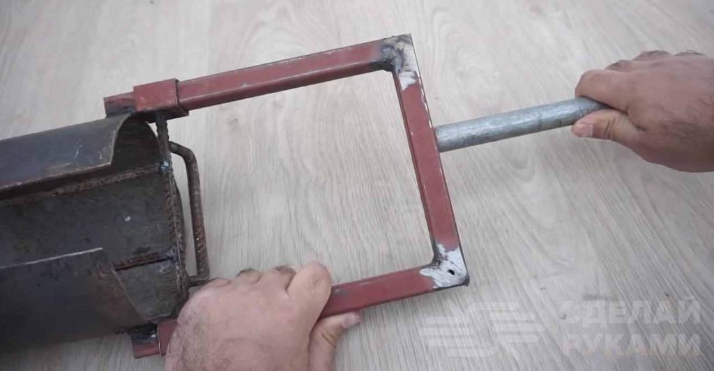 Также к ней надо приварить скобу, изготовленную из арматуры. И на последнем этапе останется лишь приварить ручку из круглой трубы.