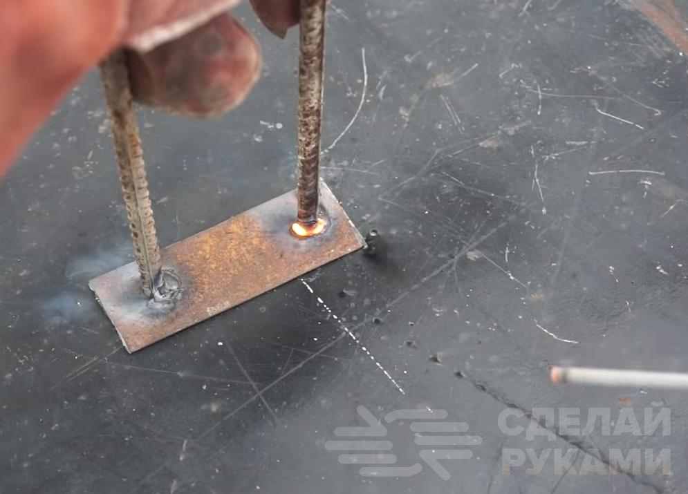 Из куска листового металла вырезаем пластину, к которой надо приварить два куска арматуры. И эту деталь автор приваривает к арматуре, соединяющей две заготовки из профтрубы.