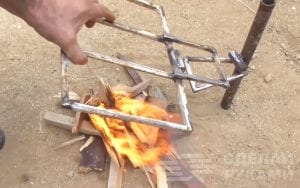 Затем из стального квадрата или профиля нужно сообразить решетку, на которой будет стоять сковорода в процессе приготовления пищи. Размеры решетки подбираются исходя их диаметра самой большой сковороды в походном арсенале посуды. Сбоку решетки необходимо приварить П-образную деталь, которая будет сцепляться с платформой на стойке.
