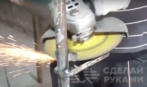 От стальной трубы среднего диаметра отрезаем болгаркой отрезок длиной 55–60 см, который будет использоваться в качестве вертикальной стойки (при необходимости можно сделать и выше). На одной из сторон вырезаем клинья треугольной формы, чтобы в итоге получилась «коронка» — она нужна для заглубления вертикальной стойки костровой подставки в землю.