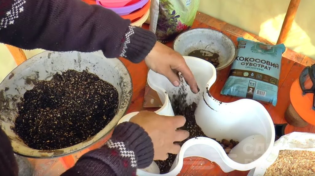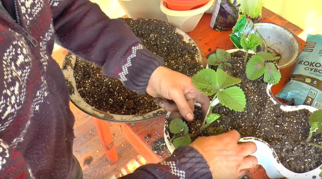 Нужно смешать грунт, песок и кокосовый субстрат. Клубника любит рыхлую почву, для этого внесите опилки. Так как в вазонах земля высыхает быстрее, чем в обычных грядках, немного керамзита на дне поможет задержать влагу.