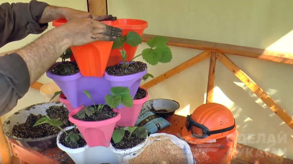 Теперь можно установить второй этаж. Лучше засаживать горшки по мере их сборки. В противном случае вы рискуете повредить кустики клубники, когда будете собирать всю конструкцию.